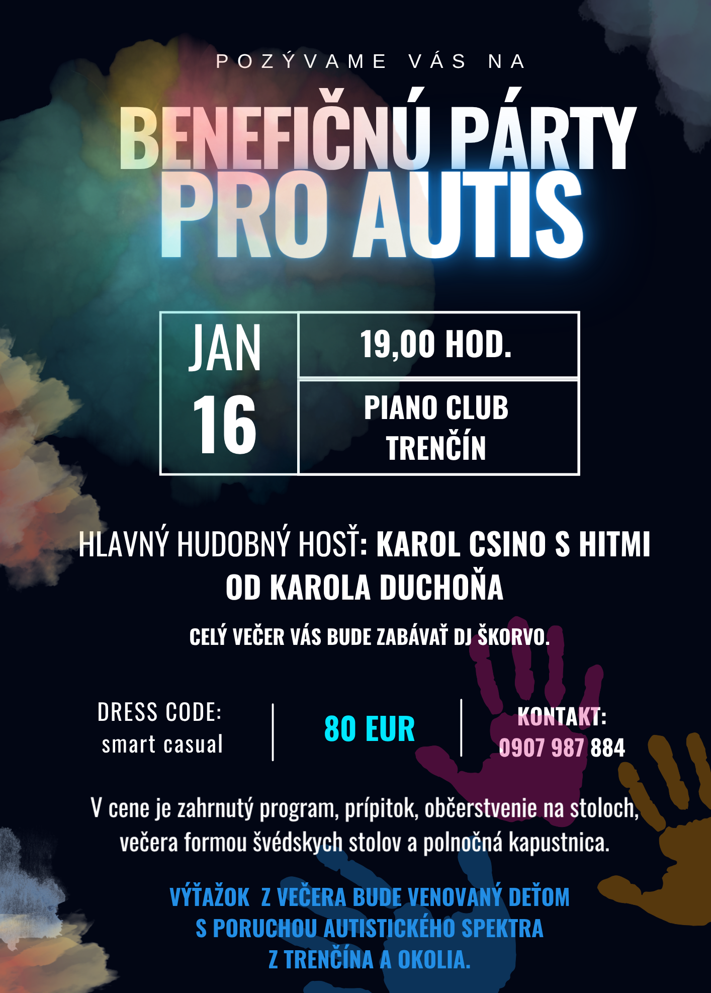 dovoľte nám opäť Vás pozvať na ďalší ročník benefičnej párty Pro Autis, z ktorej výťažok bude venovaný deťom s poruchou autistického spektra z Trenčína a okolia.